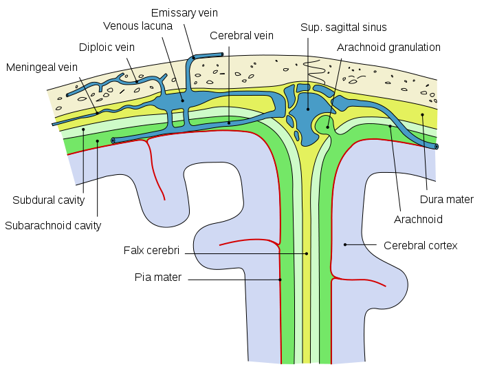 Оболочки мозга (жёлтым окрашена твёрдая оболочка, зелёным – пространство между паутинной и мягкой) и мозговые вены с синусами твёрдой оболочки. (Wikipedia.)