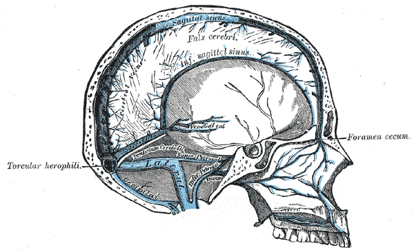 Синусы твёрдой мозговой оболочки (обозначены синим). (Wikipedia.)