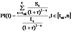 Рассмотрим другие показатели оценки эффективности инновационного проекта. Индекс рентабельности инвестиций (PI) с учетом дисконтирования может быть представлен в виде: (5) Введенный показатель характеризует (в при¬веденной форме) результат работы ка-ждой еди¬ницы вложенных на интервале [tоi, tоi + n] средств данного элемента инновационного проекта на последующее развитие событий (St, t [toi,T]) по сравнению со случаем, когда данное i-е мероп¬риятие не реализуется. Если значение >1, то на основе общих рекомендаций считается возможным позитивное решение о целесообразности реализации данного проекта. Однако при стандартном методе инвестиционного оценивания можно определить конечный результат отдачи капиталовложений только на последнем этапе.