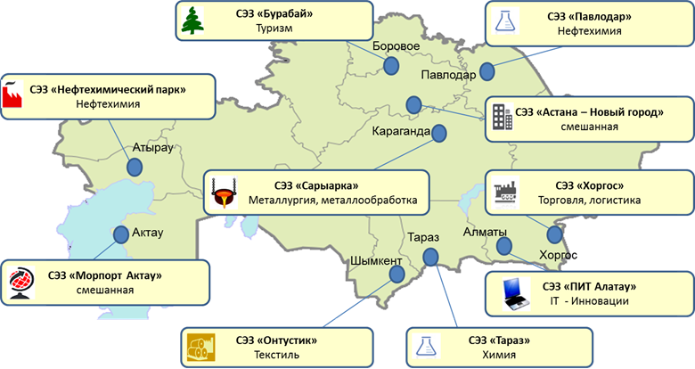 Реализация программы по развитию СЭЗ требует усиленного контроля В Казахстане действует девять специальных экономических зон (СЭЗ), и в этом году планируется запустить десятую. Правительство РК давно и активно ведет работу по их развитию, не без основания полагая, что отданные под бизнес-проекты территории позволят значительно оживить экономику регионов. Чаще всего функционирование СЭЗ рассматривается как важное звено в реализации принципов открытой экономики. Их функционирование связывается с либерализацией и активизацией внешнеэкономической деятельности. Преимуществами СЭЗ являются: особый таможенный режим, особый налоговый режим, особый валютный режим. История дает возможность учиться на ошибках История создания СЭЗ в Казахстане начинается с ноября 1990 года, когда был принят закон «О свободных экономических зонах в Казахской ССР». В данный документ неоднократно вносились изменения, но первые СЭЗ (Жайрем-Атасуская в Жезказганской области, Алакульская и Жаркентская в Талдыкорганской области, субзона на базе предприятия «Талдыкорганвнештранс» в Талдыкоргане, Лисаковская в Костанайской области и свободная торговая зона «Атакент» в г. Алматы) бесславно почили в бозе, проработав два года. Предпринимаемые c середины 90-х попытки также не приводили к стремительному успеху.  Однако идея продолжить активную работу по развитию СЭЗ оставалась актуальной. 21 июля 2011 года Президент РК Нурсултан Назарбаев подписал закон «О специальных экономических зонах в РК», направленный на повышение эффективности управления и функционирования СЭЗ. Новый закон позволяет привлекать в СЭЗ профессиональные управляющие компании. Кроме того, законодательно был определен целый пакет налоговых льгот. В результате предпринятых шагов в стране успешно стали функционировать 6 СЭЗ: «Астана – новый город», «Морпорт Актау», «Парк информационных технологий «Алатау», «Онтүстік», «Национальный индустриальный нефтехимический технопарк», «Бурабай», а также две индустриальные зоны в городах Астана и Караганда. В конце 2011 года в Казахстане дополнительно были созданы три новые СЭЗ с конкретной отраслевой направленностью. В Карагандинской области начала работу СЭЗ «Сарыарка» – развитие металлургии и металлообработки, в Алматинской области СЭЗ «Хоргос – Восточные ворота» – развитие транспортно-логистического потенциала, в Павлодарской области СЭЗ «Павлодар» – развитие химической и нефтехимической отраслей промышленности. К концу 2011 года было зарегистрировано более 300 участников СЭЗ. СЭЗ «Астана – новый город» Согласно стратегическому плану ГУ Управления администрирования СЭЗ «Астана – новый город» на 2011–2015 гг., главная цель СЭЗ заключается в развитии нового административно-делового центра столицы. Также в соответствии с ГПФИИР РК на 2010–2014 годы развивается промышленная зона города Астаны – Индустриальный парк, территория которого отнесена к территории СЭЗ «Астана – новый город». Весомым преимуществом Индустриального парка является его территориальная встроенность в границы нового административного центра города. Это обеспечивает оснащенность современной инфраструктурой и благоприятные условия для быстрого строительства и последующей эксплуатации промышленных объектов. Территория Индустриального парка составляет 598 га. По да