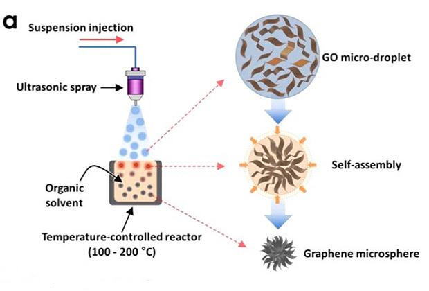 Сначала хлопья оксида графена методом сверхзвукового распыления превращали в микрокапли, а те затем впрыскивали в органический растворитель, смешанный с аскорбиновой кислотой, при температуре 160 градусов Цельсия. В этой среде оксид графена превращался в графен, вода испарялась из капель и возникали микросферы, по форме напоминающие помпоны.