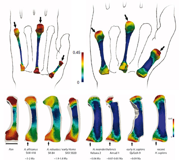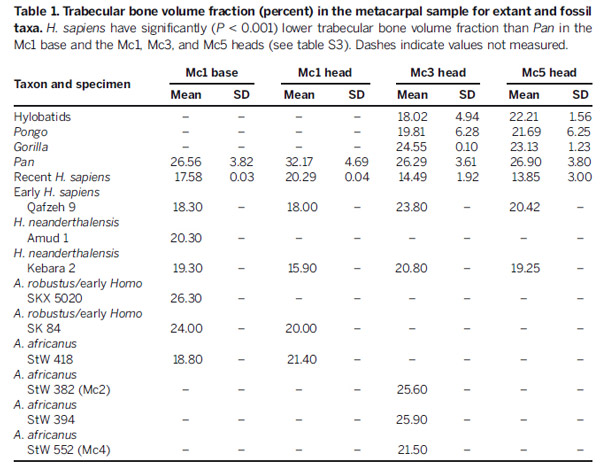 По сравнению с шимпанзе у предков современного человека уменьшился объем губчатой ткани. Это говорит о снижении общих нагрузок на руку вообще и на большие пальцы в частности. Если у австралопитеков этот показатель выражен еще нечетко, то у ранних людей он уже сильно отличается от шимпанзе. Получается, что австралопитеки все еще как следует натруживали свои руки: по-видимому, они продолжали лазать по ветвям. Впрочем, повышенные нагрузки на руки были, судя по этому показателю, характерны и для неандертальцев и ранних сапиенсов. Вряд ли эти последние всё еще оставались древесными жителями, так что повышенный объем губчатой ткани может указывать просто на более тяжелый ручной труд во всех его проявлениях.