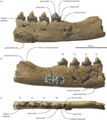 Фрагмент ископаемой челюсти Eotaria crypta и зубов на ней