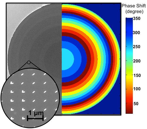 Слева – фотография поверхности плоской линзы с нанесенными на нее наноантеннами, полученная с помощью электронного микроскопа. Справа – характер фазового сдвига, реализуемого плоской линзой для фокусировки луча света. Фото: Francesco Aieta/Harvard Univers