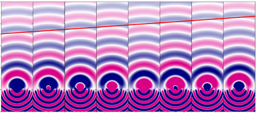 Иллюстрация механизма преломления света метаповерхностью. Наноантенны реализуют фазовый сдвиг, поглощая падающий свет и излучая его с некоторой задержкой, в результате волновой фронт (красная линия) после прохождения сквозь поверхность отклоняется на опре