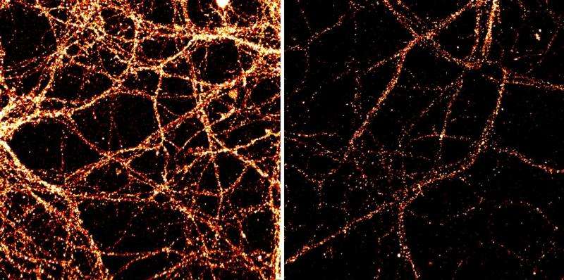 Нейроны гиппокампа мыши: слева – нормальные клетки с большим количеством рецепторного белка GluR1 (окрашен оранжево-жёлтым), справа – нейроны с повышенной активностью гена Tet3, подавляющего синтез GluR1. (Фото Huimei Yu / Johns Hopkins Medicine.)