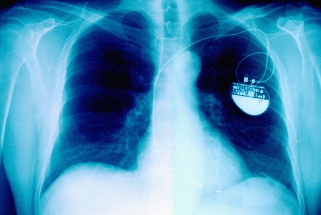 Обычный проводной кардиостимулятор на рентгеновском снимке. (Фото Charles O'Rear / Corbis.)