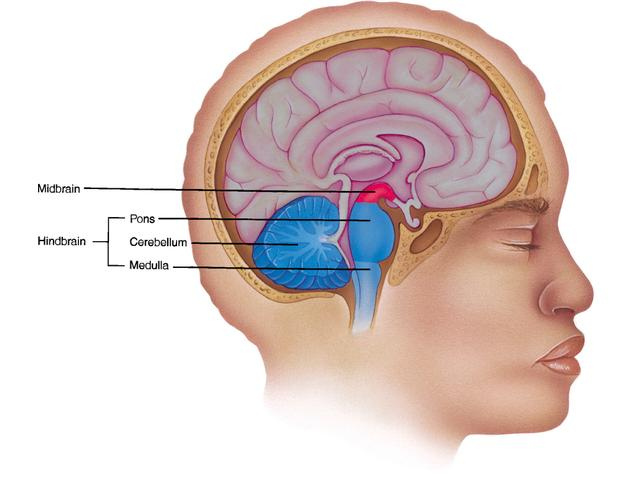Человеческий мозг с обозначенным синим стволом мозга и красным – средним мозгом. Верхнее двухолмие и парабигемиальные ядра – одни из структур среднего мозга. (Фото CrazyJoesPsychNOTES / Flickr.com.)