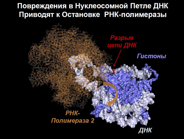 Петля ДНК на нуклеосоме и фермент РНК-полимераза; разрыв в цепи ДНК останавливает полимеразу, что служит сигналом системам ремонта ДНК. (Рисунок Надежда Герасимова.)