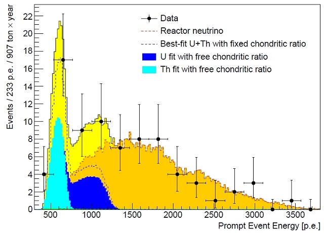 Данные, полученные за 2056 дней работы детектора. Темно-желтое – ожидаемые нейтрино от реакторов, желтое – геонейтрино, получившиеся при распаде урана и тория, черное – экспериментальные значения. Илл: arXiv:1506.04610