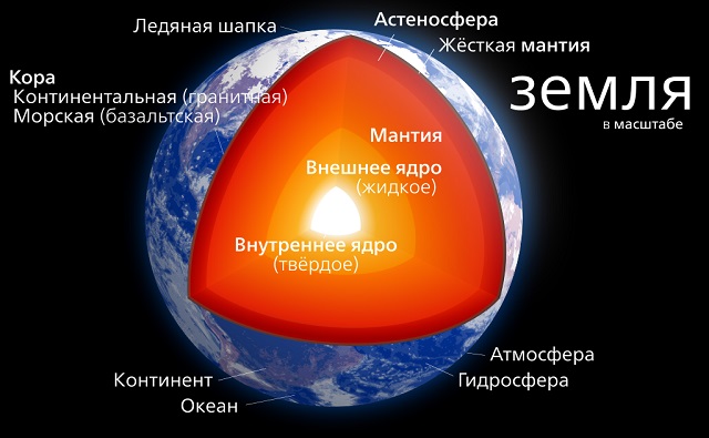 У исследователей строения Земли не так уж и много способов, чтобы заглянуть внутрь нашей собственной планеты. Кольская сверхглубокая скважина была пробурена до глубины немногим более 12 километров, что ничтожно мало по сравнению с радиусом Земли, который равен примерно 6 000 километров. Намного больше данных было получено из сейсмических исследований. Изменения скорости и направления волн, возникших при землетрясениях, позволили обнаружить границы зон с различными физическими свойствами. Было установлено, что в центре Земли находится твердое ядро, радиусом приблизительно 1 200 километров, окруженное слоем жидкого вещества, толщиной около 2 300 километров. Температура в центре Земли достигает 5 000 градусов и выше, но ближе к поверхности она уменьшается, оставаясь сравнительно высокой в местах литосферных разломов.
