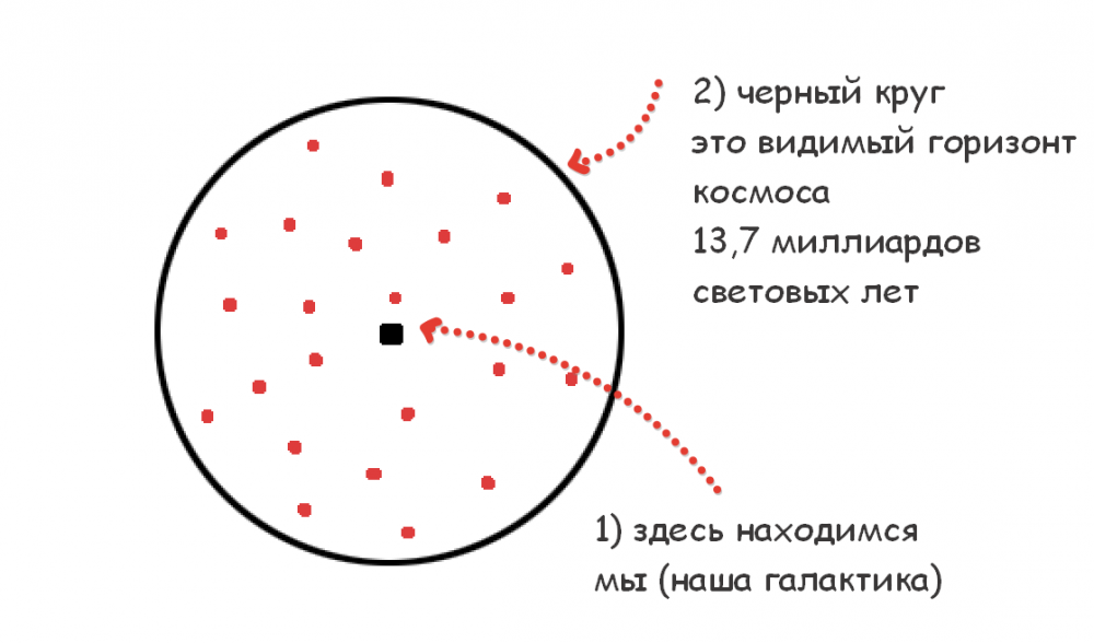 Это, условная схема нашей вселенной. Мы находимся в центре, кругом обозначен видимый нами горизонт вселенной, за него мы не можем заглянуть, почему? В космосе, очень большие расстояния и исчислять их в километрах не совсем удобно, поэтому за еденицу исчисления принимают световой год, Световой год это расстояние которое свет проходит за один год.